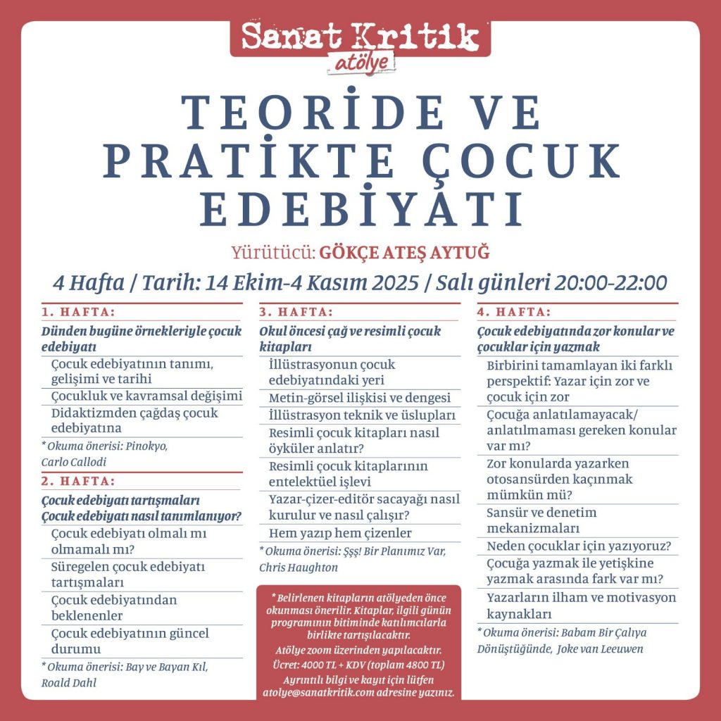 Sanat Kritik Atölyeleri devam ediyor. Atölyelerimiz ile ilgili ayrıntılı bilgi ve kayıt işlemleri için atolye@sanatkritik.com adresinden bizimle iletişime geçebilirsiniz.