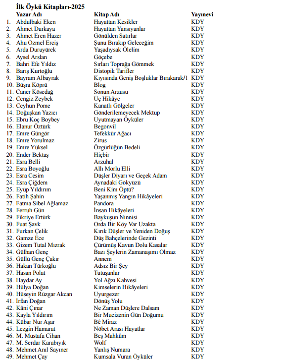 Belirtildiği gibi 2025 yılında toplam ilk ve yeni öykü kitabı 912’ye ulaşmıştır. 2025 yılının öykü kitaplarına gelince: Kitap sıralaması daha önce olduğu gibi yine yayınevlerinin yayımladığı ilk ve yeni öykü kitapları toplam sayısına göre alfabetik olarak yapılacaktır. Bu yıl dikkati çeken bir konu da şudur: Önceki yıla göre daha çok yayınevi, oransal olarak daha az kitap yayımlamıştır. Büyük küçük 266 yayınevi toplamda 912 kitap yayımlamışken, yayınevi başına yaklaşık olarak 3,4 kitap düşmektedir.