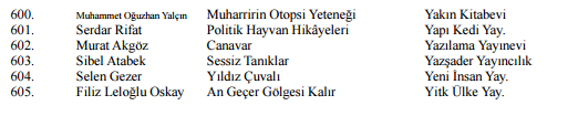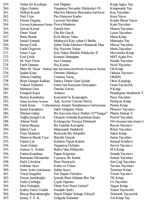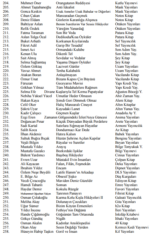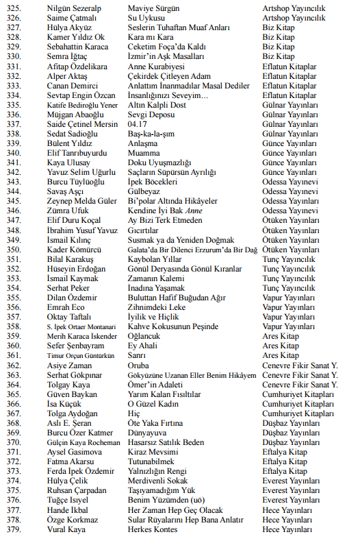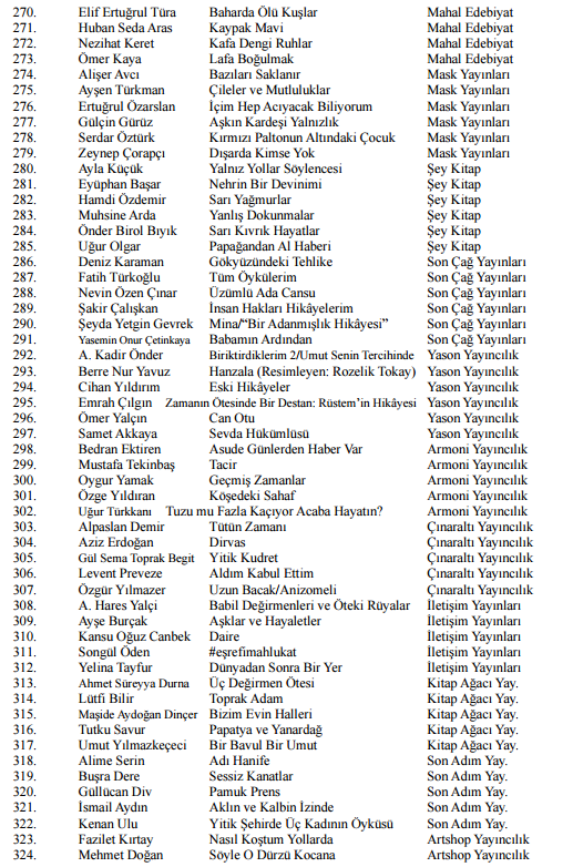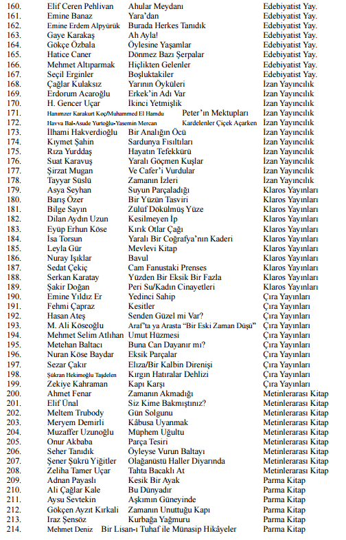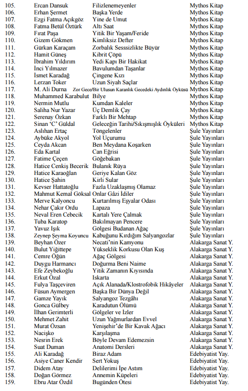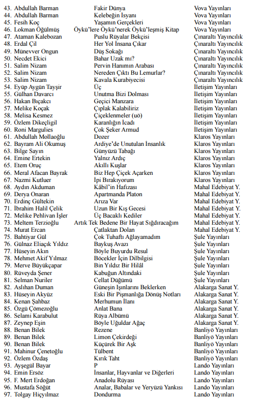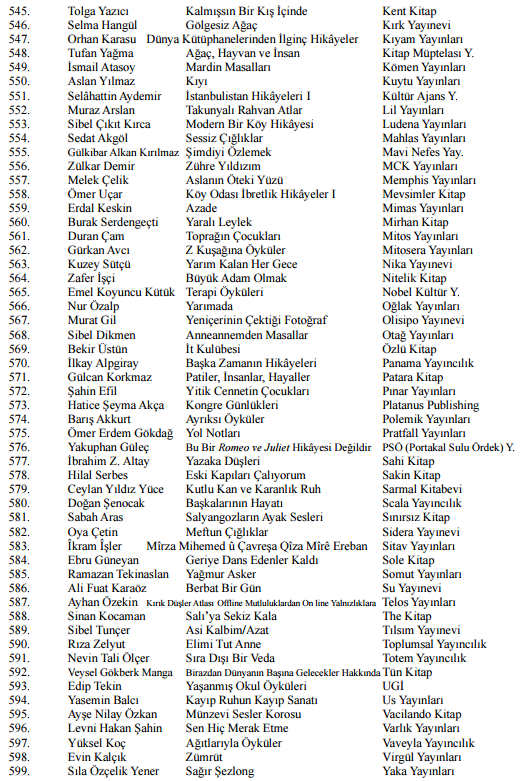 Vova 16, Edebiyatist 15, Hece, İzan, Mahal, Metinlerarası ve Zet 13’er, Çınaraltı, Çıra, İletişim, Lando 12’şer, Parma ve Uzam 10’ar kitap yayımlamışlardır. Kutlu 9, Mask, Şey 8’er, Artshop, Banliyö, Cinius, Everest, Son Adım, Son Çağ, SRC, Tunç, Vapur, Yason 7’şer; Armoni, Dorlion, Gece, Gülnar, Günce, Kitap Ağacı, Ötüken 6’şar, Alaska, Ares, Düşbaz, Herdem, İz, Ketebe, Kırmızı Çatı, Odessa 5’er kitap; A7 Kitap, Akıl Fikir, Aysima, Biz, Can, Dergâh, Eflatun, Fabrik, Kalyora, Kırmızı Kalem, KMD, Loras, MST, Notos, Sel, Vaveyla, Yitik Ülke 4’er kitap; Ahenk, Alkali, Ayrıkotu, Bilgi, Cenevre, Cumhuriyet, DLS, Düş Kurguları, Edisyon, Eftalya, Eksik Parça, h2o, Hiçbişey, İthaki, Kanguru, Kitap Otağı, Matruşka, Od, Okur, Ozan, Servet, Sinada, Vacilando, Yapı Kredi 3’er kitap ve Ağustos Böceği, Almina, Atakar, Babek, Defne, Dipnot, Ekinoks, Ender Şeyler, Epona, Erda, Evrensel Kültür, Favori, Göl, Hazeran, İnsan ve Hayat, Kalem Lügat, Karizma Liz, MBK, Mevsimler, Mona, Mondes, Motto, Muhtelif, Potkal, PSÖ, Remzi, Sakin, Sarmal, Sözcükler, Tılsım, Us, Vesta, 24 Yayınları 2’şer kitap yayımlamışlardır.