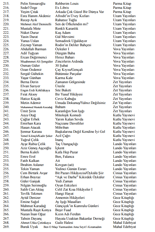 Şimdi de alfabetik sırayla bir biçimde tanıdığım ve dikkatimi çeken bazı yeni ve genç yazarları anarak herkesin emeğinin önemli ve okunmaya değer olduğunu belirtmeliyim: Aslı E. Şeran (Öte Yaka Fırtına), Ayla Küçük (Yalnız Yollar Söylencesi), Ayşe Burçak (Aşklar ve Hayaletler), Ayşe Nilay Özkan (Münzevi Sesler Korosu), Başak Arslan (Sardunyalar Güneşe Bayılır), Dilan Özdemir (Buluttan Hafif Buğudan Ağır), Emel Şentürk Kaya (Oysa Kendinden Kaçamazdın), Erkut Özal (Iskarta), Filiz Leloğlu Oskay (An Geçer Gölgesi Kalır), Güven Baykan (Yarım Kalan Fısıltılar), İrem Üreten (Saat Yönünün Tersine), Mesut Barış Övün (Neyse ki Günler Uzadı), Ş. Burak Çelik (Zaman Artığı) ve Yelina Tayfur (Dünyadan Sonra Bir Yer).