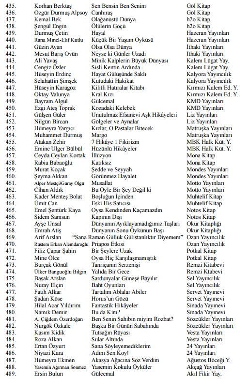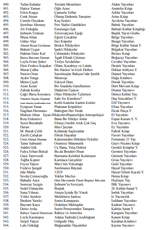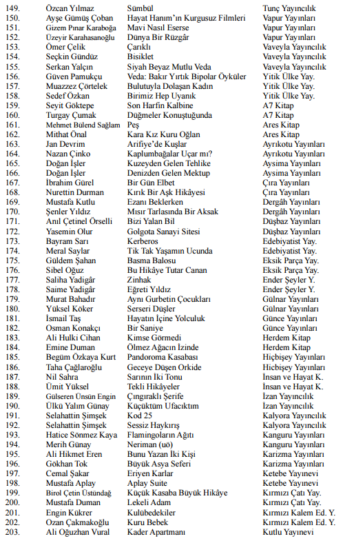 | İlk Öykü K. | 3.994 | 448 | 487 | 605 | Yeni yazar sayısı |