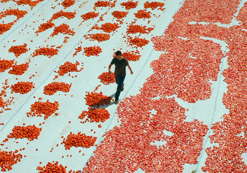 Açılış sahnesinde, akşam vakti bir düğünde geçtiğini düşündüğümüz davul zurna eşliğindeki halay ve sırayla geçen insan yüzleri kısa bir süre devam eder; hemen ardından yerini filme hâkim olan sahneye bırakır: Eyüp, Hemme, kadın ve çocuk işçilerin sıcağın altında gün içinde tarlada domates kurutmak için çalıştığı sahne. Ağır, durağan ve çok gürültülü olmayan bir atmosferde çalışmaya devam ederler. Eyüp, ustabaşından bir süredir yevmiyesini alamamıştır. Ara ara hatırlatır ama geçiştirilir. Sıcağın boğuculuğu, çalışma şartı, Hemme ile olan sürtüşme, çalışma koşulları ve ardından kendisine karşı üstünlük kurma çabasıyla burun buruna gelirler. Çalışmaya devam eder ama içine sinmez. Daha sonra Hemme’yle oluşan gerginlikte onun Eyüp’e küfür savurduğunu öğreniriz.